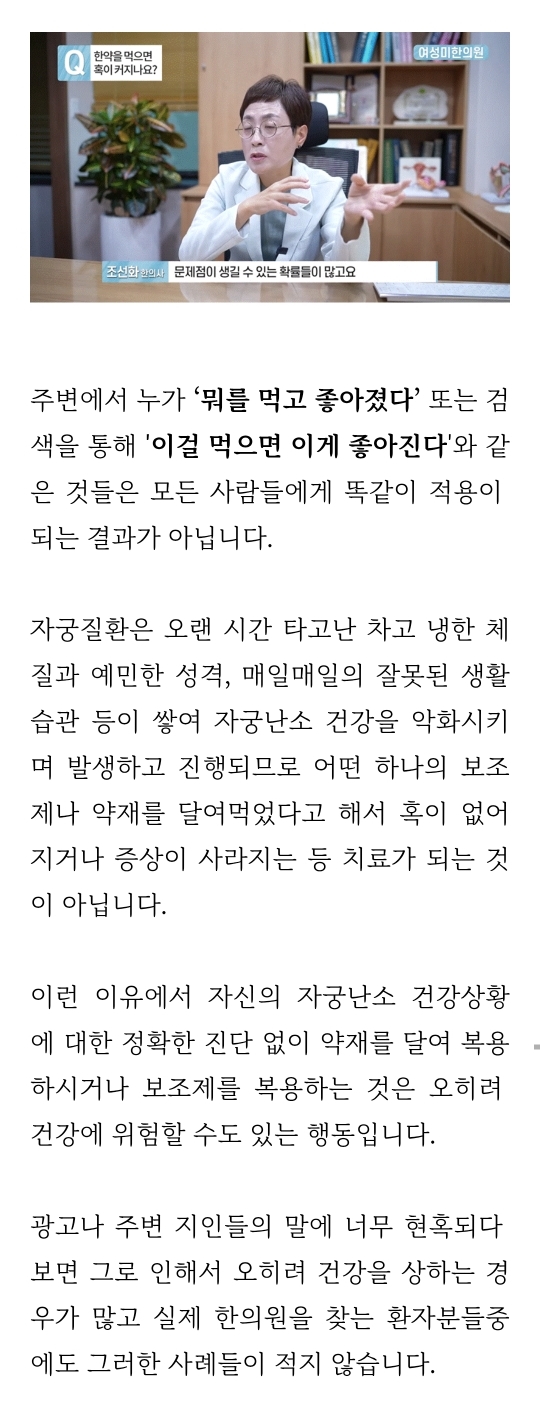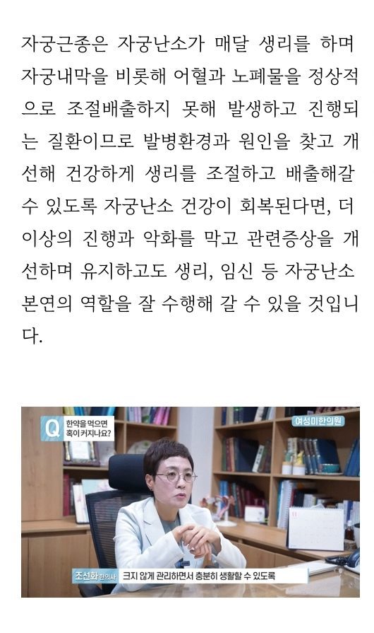 일반적으로 한약은 자궁근종에 대한 직접적인 치료효과는 그리 크지 않습니다.