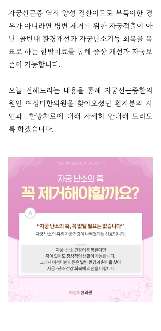 - 면역력 증진: 체질 개선을 통해 면역력을 높여 자궁선근증의 진행을 늦춤