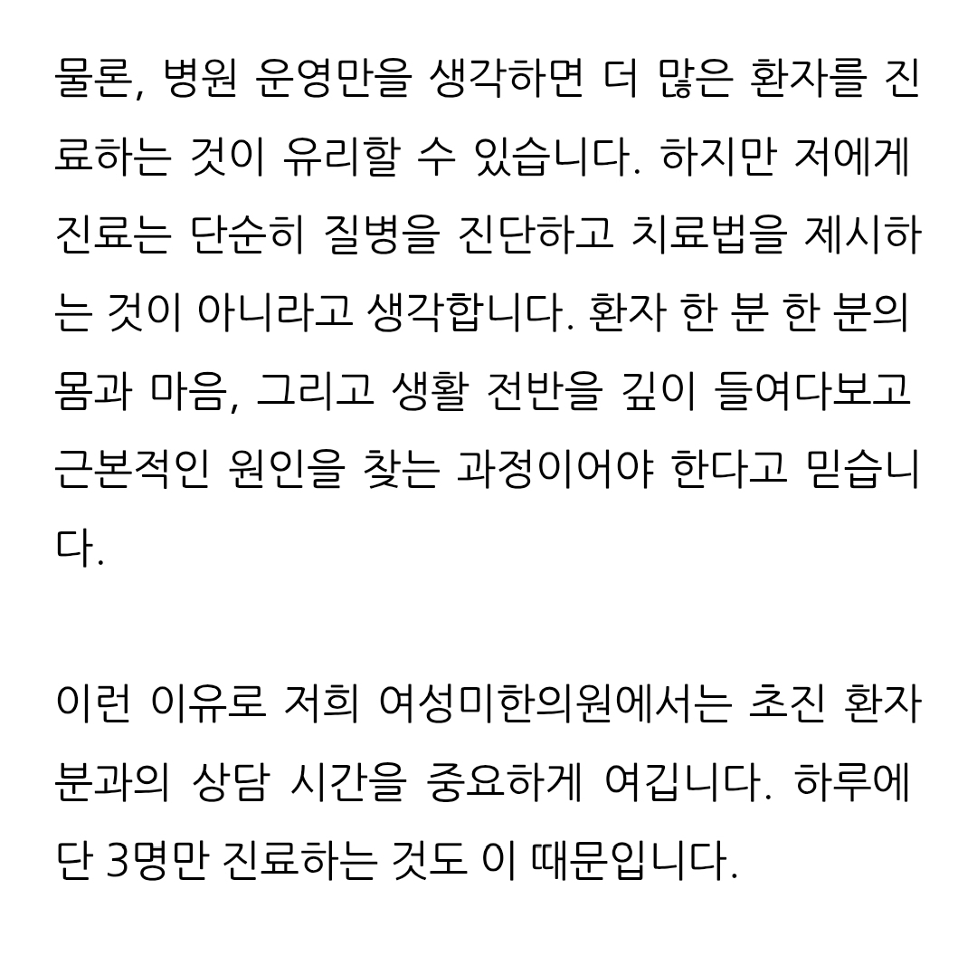 호르몬 치료는 다양한 부작용을 동반할 수 있지만, 자궁선근증한의원 치료는 체질과 증상에 맞춰 처방이 이루어지므로 부작용이 적고 안전하게 치료할 수 있습니다.